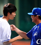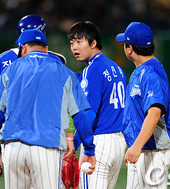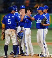 류중일 감독, '(정)인욱이 승리 축하한다'