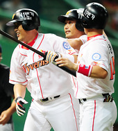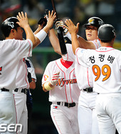 2011.08.04 21: 46축하받는 만루포 최동수! 환한 미소!'