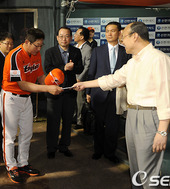 2011.08.07 20: 59'선수단에 금일봉 전달하는 김승연 한화그룹회장'