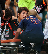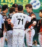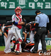 2011.08.14 18: 07'리즈의 투구에 얼굴 맞는 강민호'