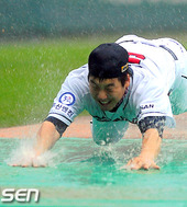 2011.08.16 18: 26우천 세리모니 김현수,'너무 빗물이 많아요'