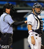 2011.08.26 20: 14미소짓는 양의지, '권영철 주심, 착각 하셨네요'