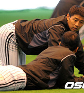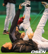 2012.02.07 16: 12박용택,'나도 고무끈으로 스트레칭 할까?'