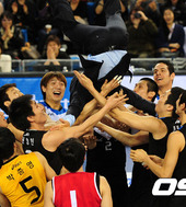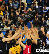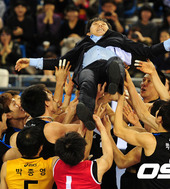 2012.02.12 14: 03헹가래 받는 오정록, '코트에 떨어질라 무서워'