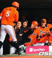 2012.03.28 15: 39이양기,'솔로포 날리고 동료들과 기쁨을 나누며'