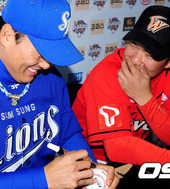2012.04.03 14: 58사인하는 이승엽, 지켜보는 정근우
