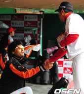 2012.04.13 16: 05조인성,'박찬호에게 축하인사와 악수를 건네며'