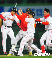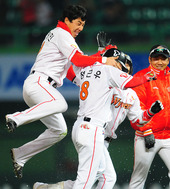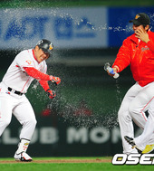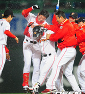 2012.04.13 21: 36정근우,'끝내기 안타 물세례! 시원해!'