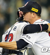 2012.04.18 22: 03포옹하는 최재훈-프록터, '짜릿한 승리 기분좋아'