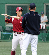 2012.04.21 14: 55김현수,'이숭용 해설위원과 공손한 하이파이브'