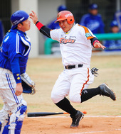 2012.04.22 16: 31김태균,'모래바람을 일으키며 홈 세이프!'