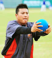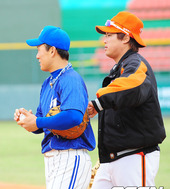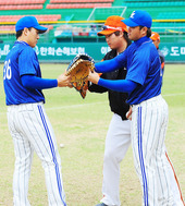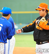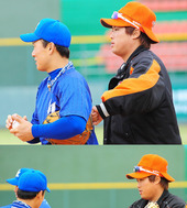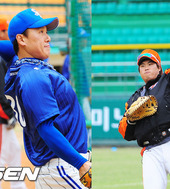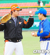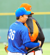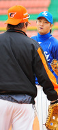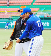 2012.04.22 12: 46류현진,'승엽이 형과 즐거운 캐치볼'