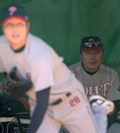 2012.04.27 13: 02'장원준의 불펜 피칭 바라보는 유승안 감독'
