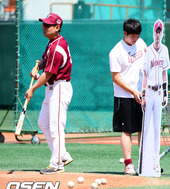 2012.06.17 15: 32심재학 코치,'누가 이택근 대형사진판에 공 잘맞추나 볼까?'