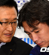 2012.07.02 16: 11귓속말 나누는 조중연 회장-홍명보 감독