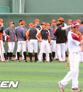 2012.07.03 16: 06양승호 감독, '민호 머리 진짜 크네'