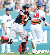 2012.07.28 17: 25홍성흔,'수비방해 아웃이라고요?'