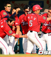 박기남을 축하해주는 KIA 선수들