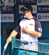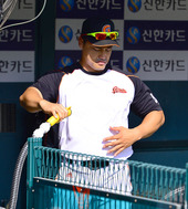 2012.08.07 16: 16홍성흔,'시원한 에어건 바람에 흐뭇한 미소'