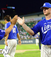 2012.08.17 19: 46강민호,'어이쿠! 허리 정확하게 맞았어'