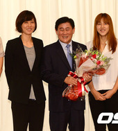 2012.08.27 12: 32선수들의 축하를 받는 WKBL 최경환 총재