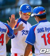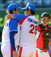 기뻐하는 한국 청소년 대표팀 윤형배-장현식-윤대영