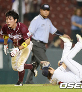 서건창,'이원석과 충돌한 머리를 잡고 홈 세이프!'