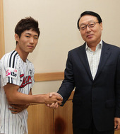 2012.09.08 18: 27금메달리스트 양학선 격려하는 LG스포츠 전진우 사장
