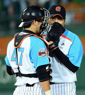 2012.09.18 20: 17정대현-강민호,'글러브로 입 가리고 비밀 이야기'
