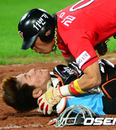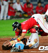 2012.09.18 20: 45강민호-김강민,'위험천만한 충돌 순간!'
