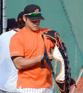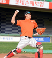 2012.10.10 17: 32홍성흔,'포수복 갖춰 입어볼까~'