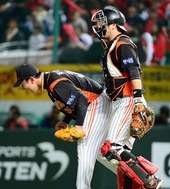 2012.10.17 22: 49승리의 포옹을 나누는 강민호와 최대성