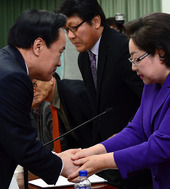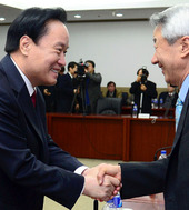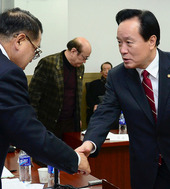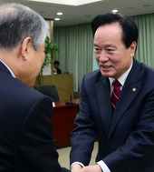 2013.02.01 13: 09한국여자연맹 김을동 회장과 악수나누는 KBA 이병석 신임 회장