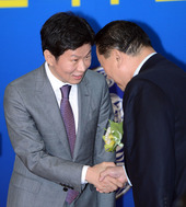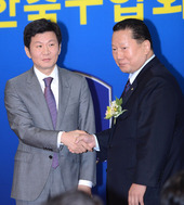 2013.03.07 15: 23'악수나누는 정몽규-김정행 신임 회장'