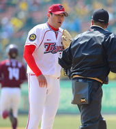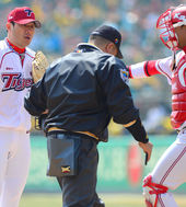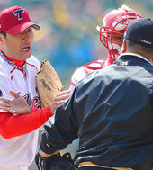 2013.03.31 14: 47항의하는 서재응,'타석에 너무 붙었잖아요'