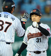 2013.04.05 19: 02손아섭,'적시타 후 코치님과 하이파이브!'