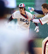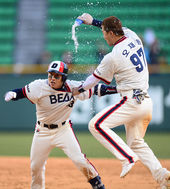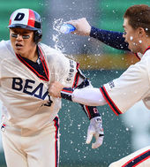 2013.04.14 18: 55오재원, '시헌이형 향한 시원한 끝내기 물세례'