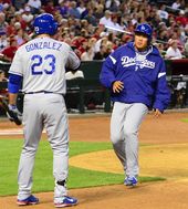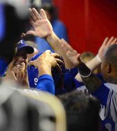 2013.04.14 11: 41득점 올리고 동료들의 환영을 받는 류현진