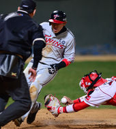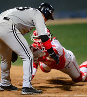 태그 당하는 박용택, '홈이 코 앞인데!'
