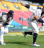 2013.04.19 17: 03홍성흔-최재훈, '점프 훈련도 남다르게~'