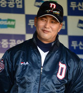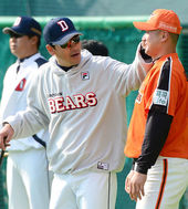2013.04.19 17: 14민병헌, '정현석 바라보며 미소가~'