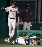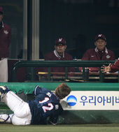 2013.04.24 21: 42넥센 더그아웃 펜스에 부딪히는 최재훈
