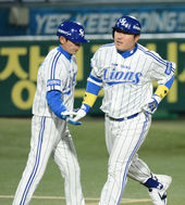 2013.05.01 22: 04솔로홈런 치고 동료들에게 축하받는 최형우