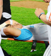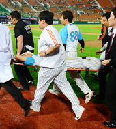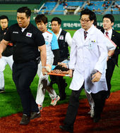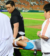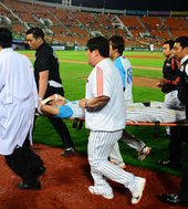 펜스에 부딪혀 정신 잃은 정훈, 들것에 긴급하게 실려나가