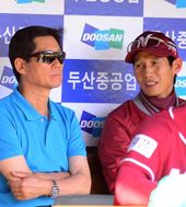 넥센 더그아웃을 방문 염경엽 감독과 이야기 나누는 정몽윤 회장