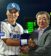 2013.07.11 20: 31구본능 총재, 이승엽 352호 홈런 기념 트로피 전달