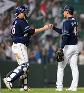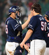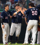 2013.08.04 21: 19양의지-정재훈,'승리의 하이파이브!'