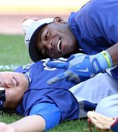 2013.08.07 07: 31류현진 품에 안긴 푸이그,'아기 미소'