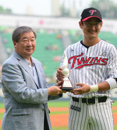 2013.08.09 19: 55박용택 1,500 안타 달성 트로피 전달하는 KBO 구본능 총재