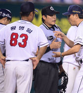 2013.08.11 20: 42파울 타구 맞은 김성철 주심,'너무 아픈데'